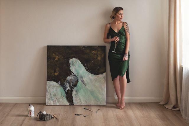 Skończyłam szkołę plastyczną po której trafiłam do poligrafii, bliżej określając drukarni. Pracowałam 10 lat w tej branży i było to spełnienie moich marzeń mimo że nigdy ich mocno nie kategoryzowałam. Byłam szczęśliwa z każdego stanowiska jakie było mi dane sprawować a miałam ich naprawdę wiele. Gdy osiągałam sukcesy i czułam że już więcej się nie nauczę, szłam dalej zaczynając od nowa i od nowa i tak w kółko. Zawsze byłam pracoholikiem, praca była moja pracą, moim hobby i miłością stawianą niemalże na pierwszym miejscu. Przyszedł covid przypominający mi o tym że kiedyś malowałam. Umierałam w domu z nudów ale nie chciało mi się wracać do tworzenia, do kolejnych zawodów że nikt nie kupi. Mój mężczyzna nie patrząc na moje humorki kupił mi sztalugę, rodzina płótna i farby. Tak to się zaczęło. Hobby szybko przerodziło się w możliwość zarobku, na początku sprzedaż szła po kosztach ponieważ głównie zależało mi na tym aby mieć pieniążki na kolejne materiały, nie potrzebowałam nic więcej. Jak to ja, zaczęłam się ucząc i szybko chłonąć nowe doświadczenia i marzyć, że może kiedyś będę miała swoją pracownię...aczkolwiek wydawało mi się to tak śmieszne i tak nie realne że nie wiem czy kiedykolwiek powiedziałam to na głos.